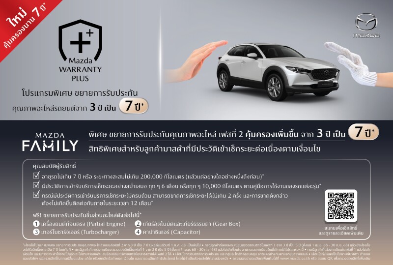 รายละเอียดและเงื่อนไขการเข้าร่วมโปรแกรม “MAZDA WARRANTY PLUS ใหม่ โปรแกรมพิเศษ ขยายการรับประกันคุณภาพอะไหล่ เฟสที่ 2 คุ้มครองเพิ่มขึ้น จาก 3 ปี เป็น 7 ปี*”